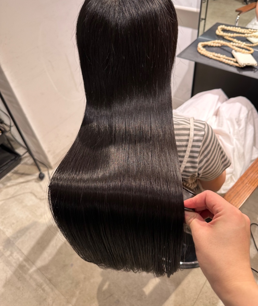 市下さんにお世話になる前は、縮毛矯正をしてもなんとなくゴワつくというか、まっすぐなのにサラサラではない、という仕上がりになることが常でした。そもそも硬め太め癖ありの髪で、星の数ほどある美容院でいろんな施術を試したり、良いと言われるシャントリをいろいろ試したり、とにかくありとあらゆる方法を試してきましたが、ほんの少し良くなったかな、くらいの効果しかなく、しかもわりと早めに元通りに戻ってしまっていました。もう綺麗な髪は手に入らないんだ、、となかば諦めていたところ市下さんのことを知り、この人なら信用できそう!と思いすぐ予約しました。