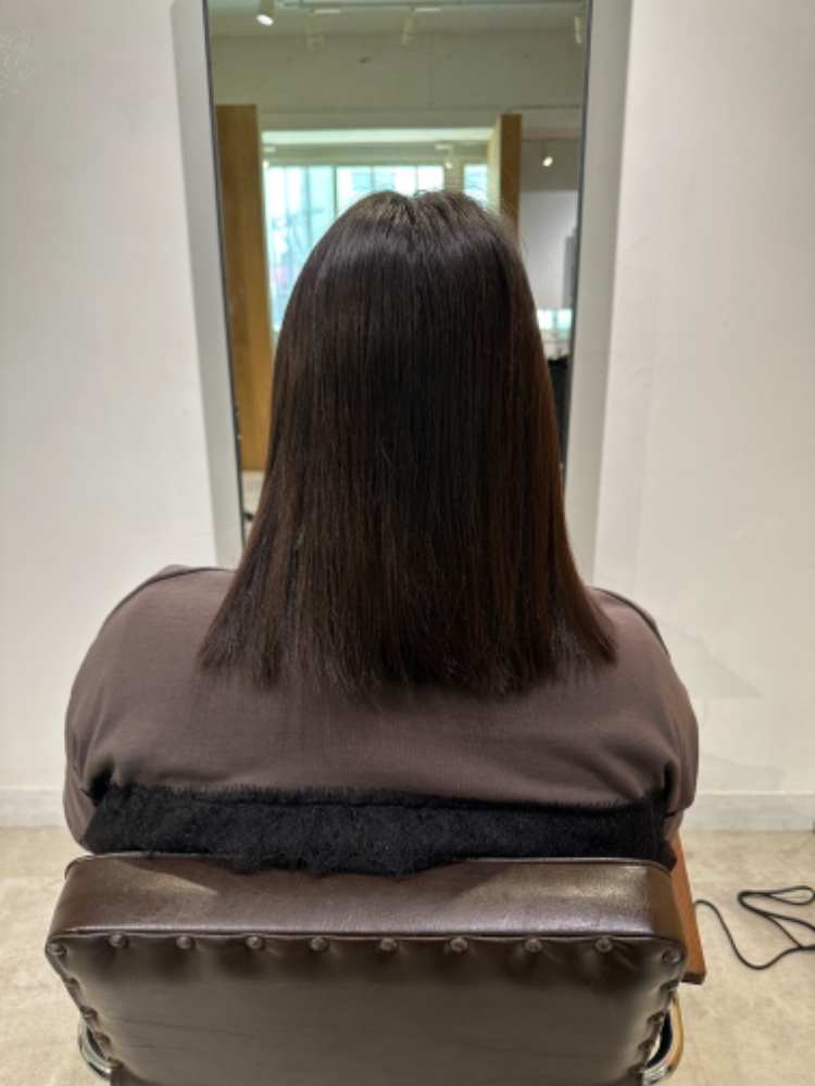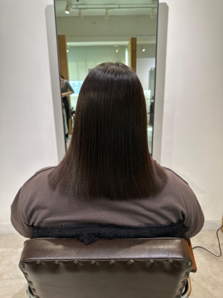 市下さんにお世話になる前は、縮毛矯正をしてもなんとなくゴワつくというか、まっすぐなのにサラサラではない、という仕上がりになることが常でした。そもそも硬め太め癖ありの髪で、星の数ほどある美容院でいろんな施術を試したり、良いと言われるシャントリをいろいろ試したり、とにかくありとあらゆる方法を試してきましたが、ほんの少し良くなったかな、くらいの効果しかなく、しかもわりと早めに元通りに戻ってしまっていました。もう綺麗な髪は手に入らないんだ、、となかば諦めていたところ市下さんのことを知り、この人なら信用できそう!と思いすぐ予約しました。